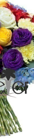 4 Red Gerbera, 3 Yellow Roses, 1 blue hydrangea, 5 purple lisianthus, 4 White & Yellow Gerbera, 2 Cream Carnations