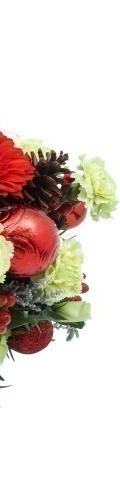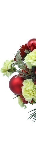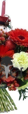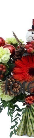 8 Lime Green Carnations, 2 Red Gerbera, Red Hypericum Berries, 5 Red Baubles, 2 Pine Cones, 10cm Snowman, 1 Red Candle